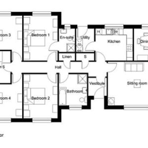 This design is spacious and well-planned; offering a comfortable and inviting living space. With five bedrooms, it caters to the needs of a larger family or those who value extra space. Upon entering, the sitting room and adjoining dining room greet you to the right, creating a warm and welcoming atmosphere. The kitchen and utility room lie straight ahead, facilitating convenient access. The left wing hosts the bedrooms, including a master bedroom with an ensuite bathroom for added privacy and comfort. Another well-appointed bathroom serves the remaining bedrooms, ensuring practicality and ease of living throughout the home.