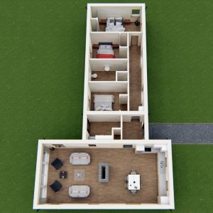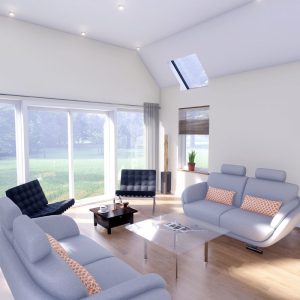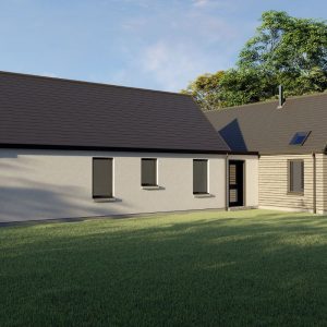 TH04 comprises a single storey dayroom wing, with vaulted ceiling and similar bedroom wing, with flat ceiling, both under a duo-pitch roof. The two wings are joined at right angles by a flat roof link entrance with utility. The dayroom wing offers open-plan living divided by a central double sided stove and features extensive glazing at the lounge end, including top lighting from two roof windows. The bedroom wing contains three double / twin bedrooms with built-in wardrobes and a separate family bathroom.